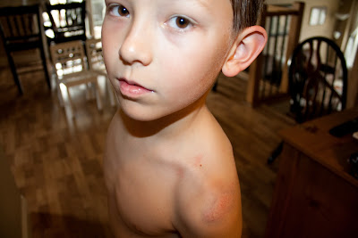 Andrew and Joey went to their friend's birthday party last week. Andrew came home and told me that his shoulder hurt. Now, I don't ignore my kids' serious injuries, but I do usually wait until they complain more than once about something. Otherwise I'd be treating every boo boo all day long. When Andrew came back again, and told me it hurt, I decided to take a look. I guess it really did hurt! That is quite a bruise. He was proud of his war wound. That must have been some game!